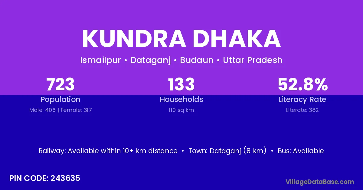 Dataganj (8 km) is the nearest town to Kundra Dhaka village for major economic activities and is located approximately 8 km away.