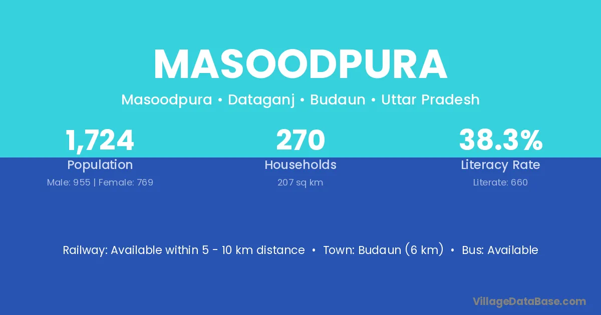 Budaun (6 km) is the nearest town to Masoodpura village for major economic activities and is located approximately 6 km away.