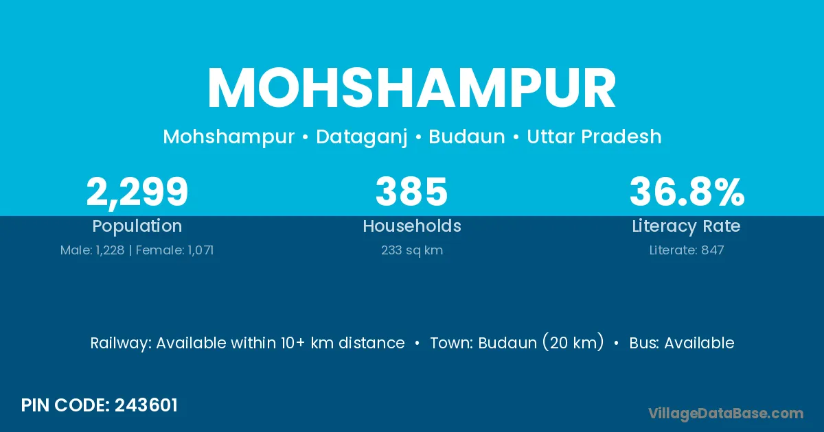 Budaun (20 km) is the nearest town to Mohshampur village for major economic activities and is located approximately 20 km away.