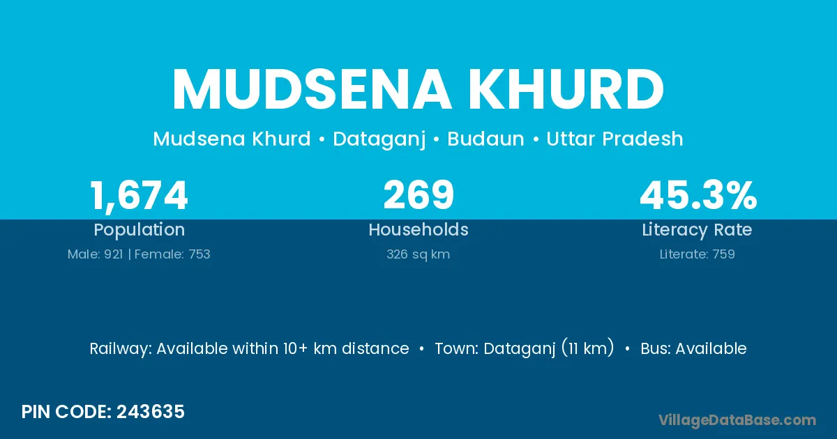 Dataganj (11 km) is the nearest town to Mudsena Khurd village for major economic activities and is located approximately 11 km away.