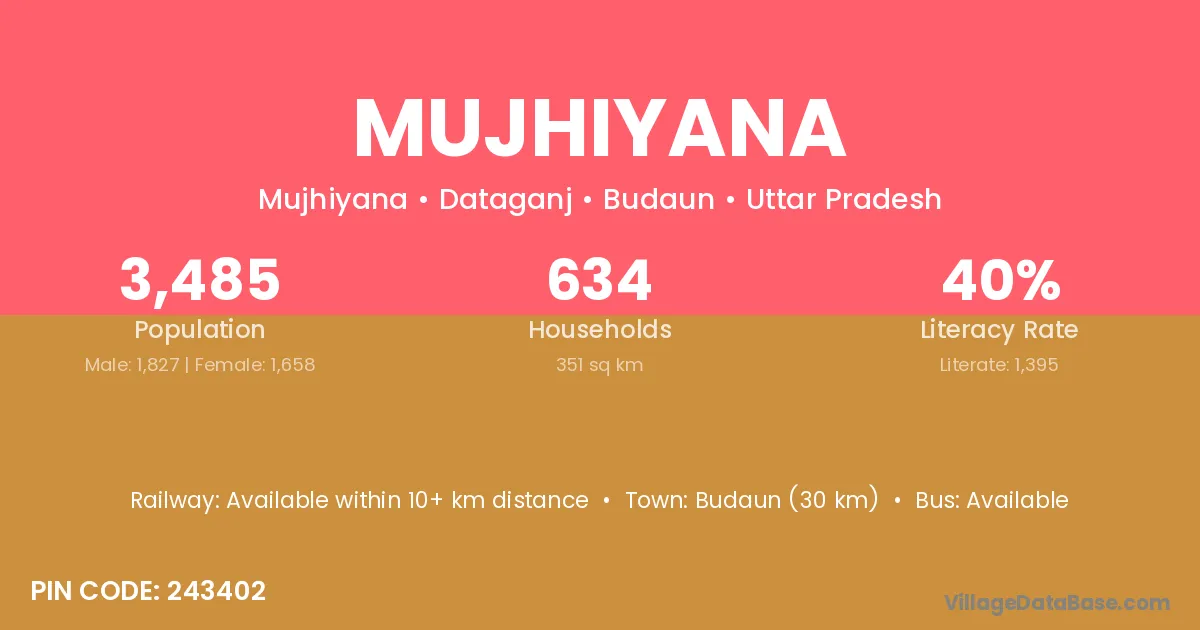 Budaun (30 km) is the nearest town to Mujhiyana village for major economic activities and is located approximately 30 km away.