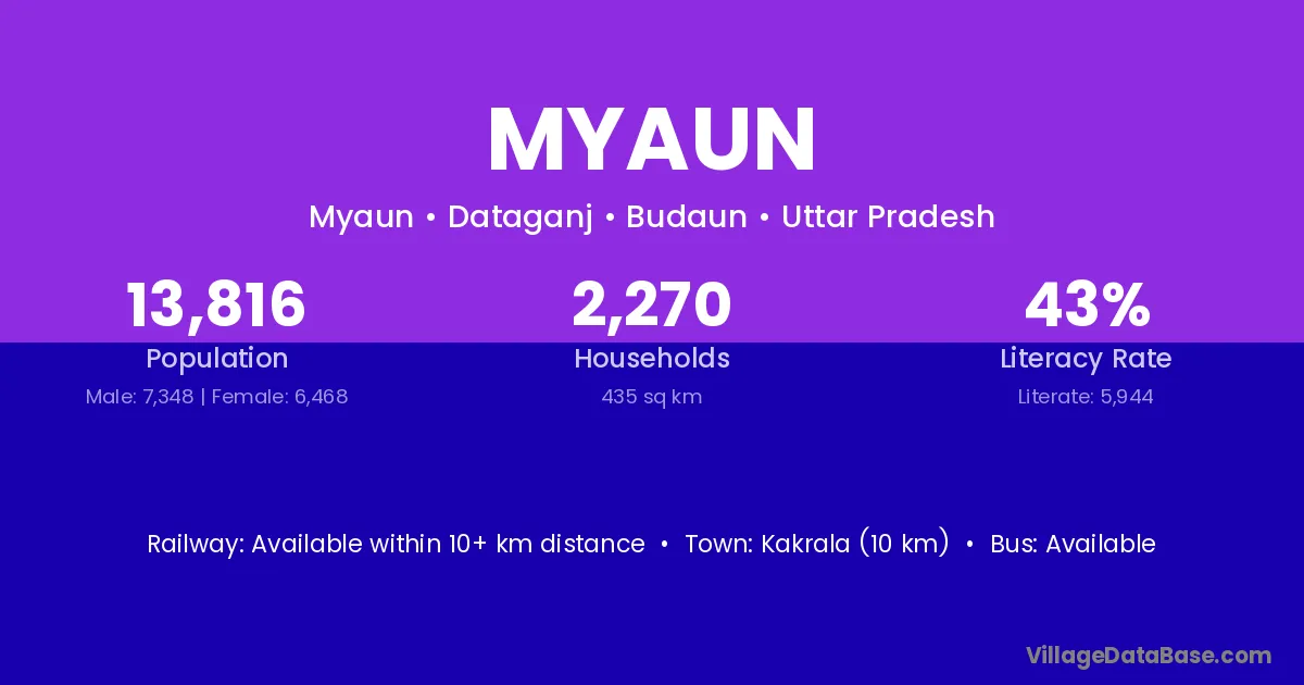 Myaun village has a total population of 13,816 people, of which 7,348 are males and 6,468 are females.