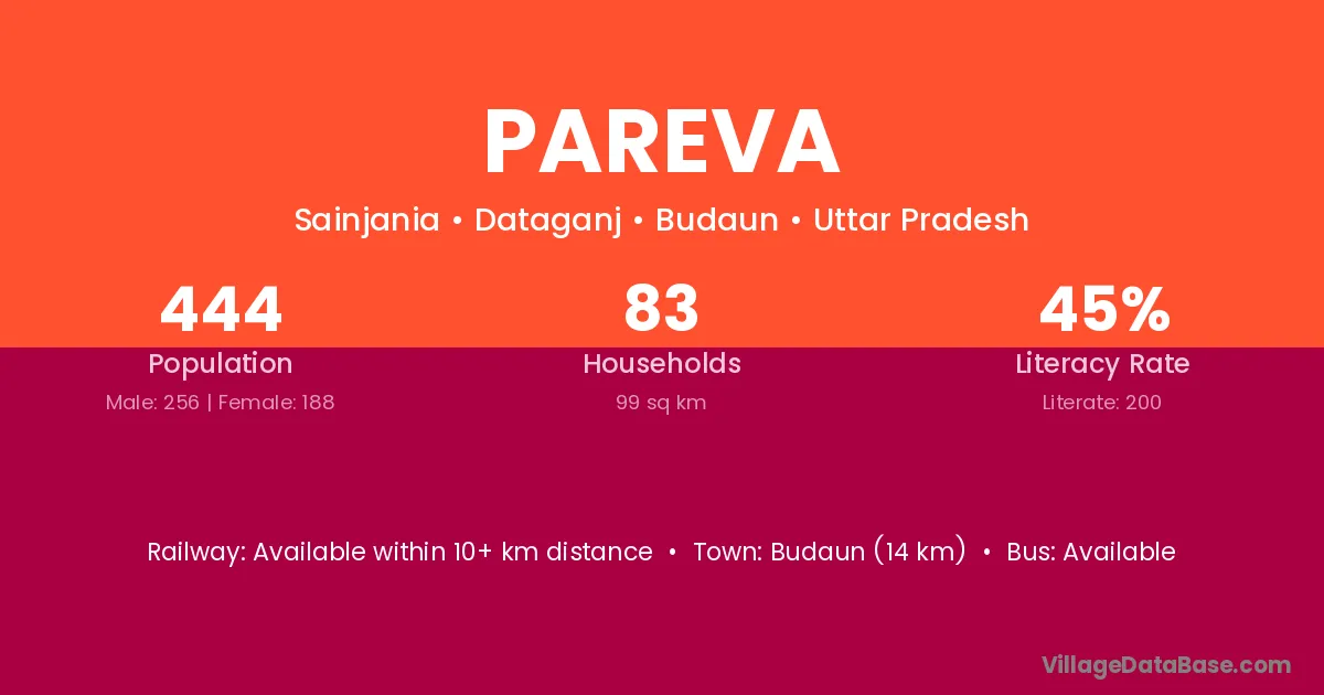 Budaun (14 km) is the nearest town to Pareva village for major economic activities and is located approximately 14 km away.