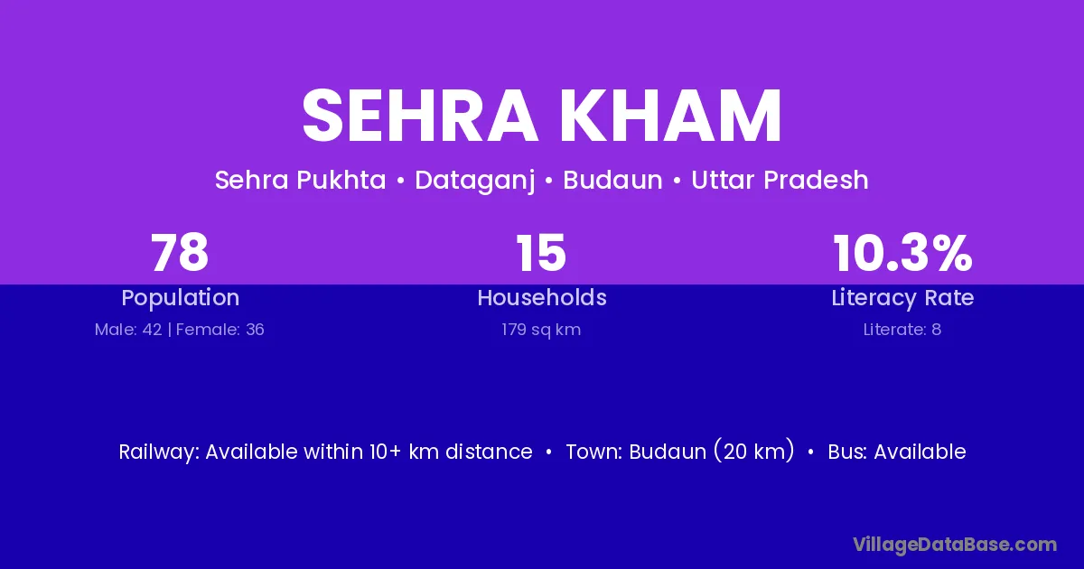 Budaun (20 km) is the nearest town to Sehra Kham village for major economic activities and is located approximately 20 km away.