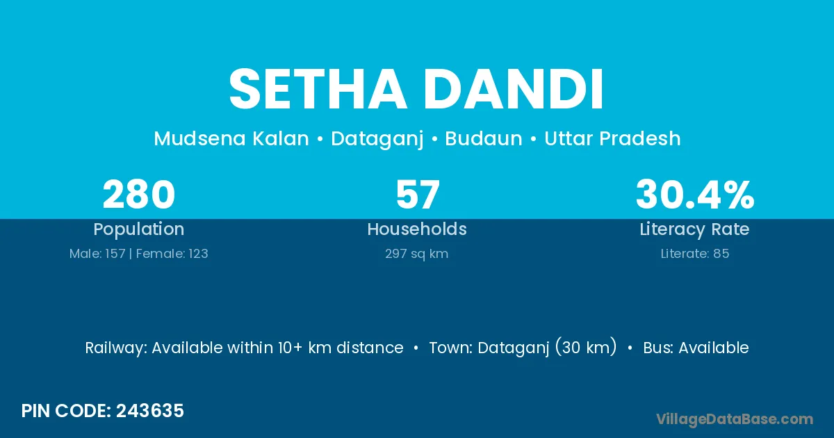 Dataganj (30 km) is the nearest town to Setha Dandi village for major economic activities and is located approximately 30 km away.