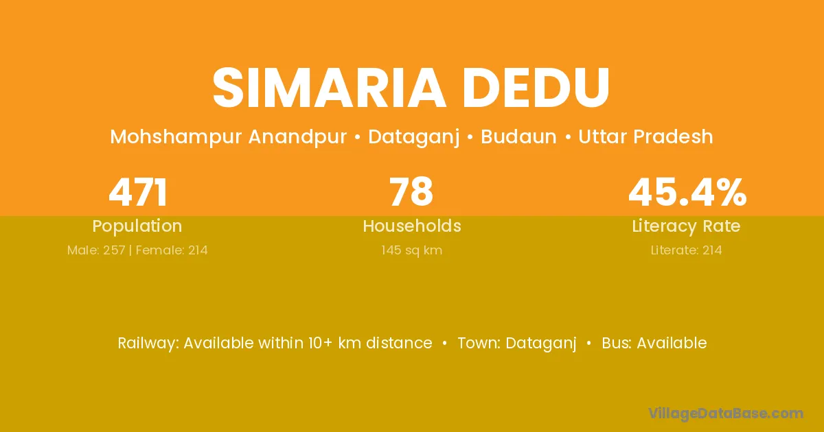 Simaria Dedu village has a total population of 471 people, of which 257 are males and 214 are females.