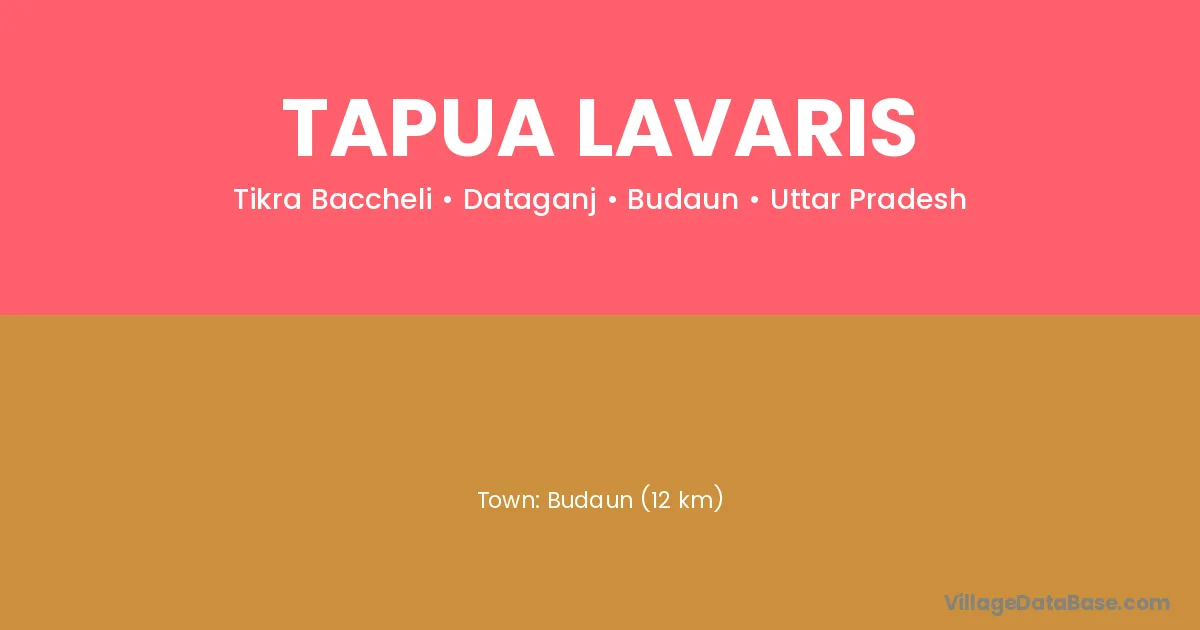 Budaun (12 km) is the nearest town to Tapua Lavaris village for major economic activities and is located approximately 12 km away.