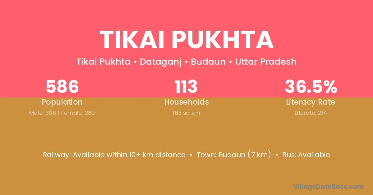 Budaun (7 km) is the nearest town to Tikai Pukhta village for major economic activities and is located approximately 7 km away.