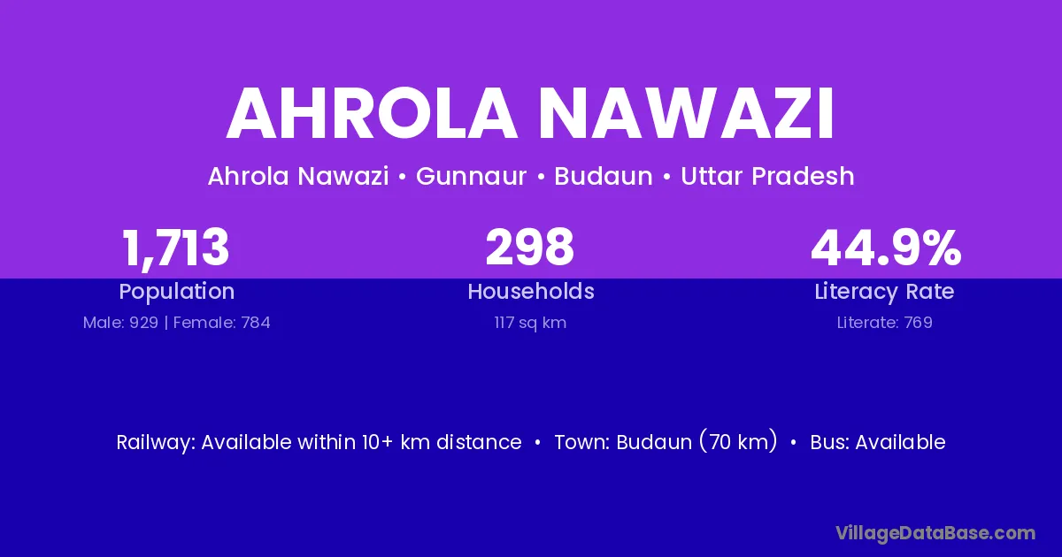 Budaun (70 km) is the nearest town to Ahrola Nawazi village for major economic activities and is located approximately 70 km away.