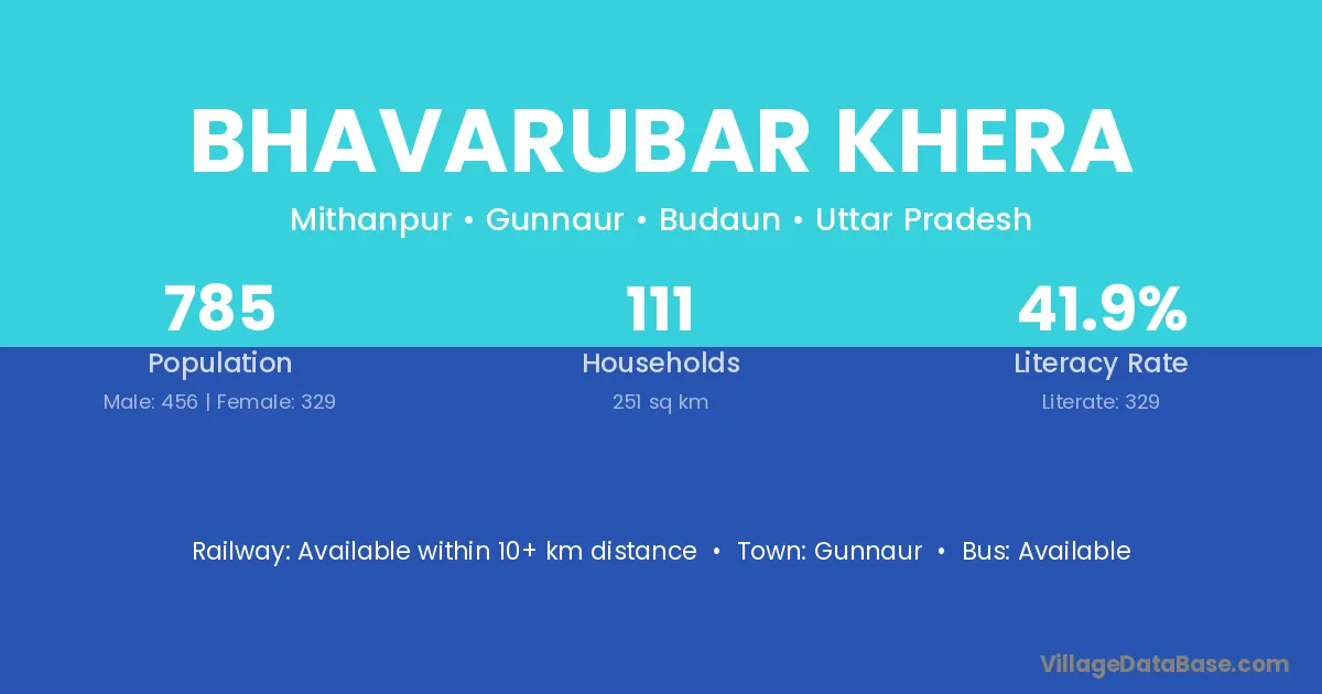 The literacy rate of Bhavarubar Khera village is 41.91%. Male literacy stands at 44.74% and female literacy at 37.99%.