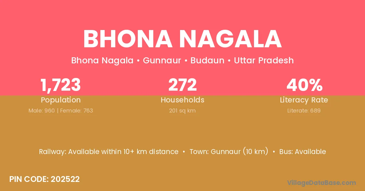 Gunnaur (10 km) is the nearest town to Bhona Nagala village for major economic activities and is located approximately 10 km away.