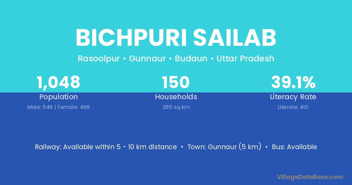 Bichpuri Sailab village has a total population of 1,048 people, of which 549 are males and 499 are females.