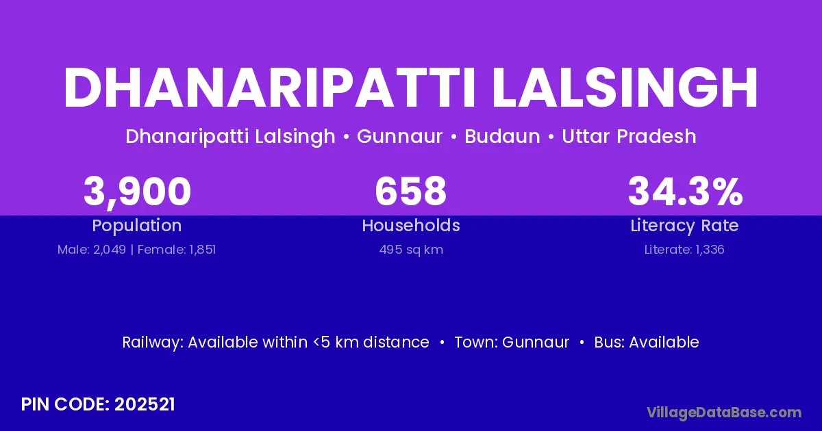 Dhanaripatti Lalsingh village has a total population of 3,900 people, of which 2,049 are males and 1,851 are females.
