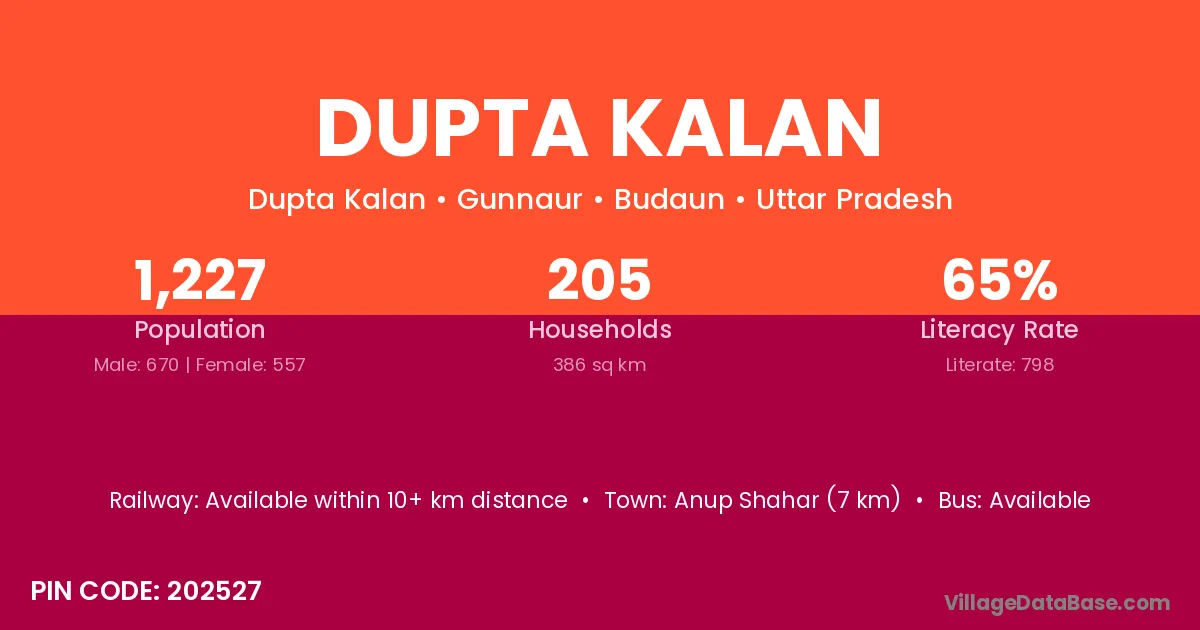 Anup Shahar (7 km) is the nearest town to Dupta Kalan village for major economic activities and is located approximately 7 km away.