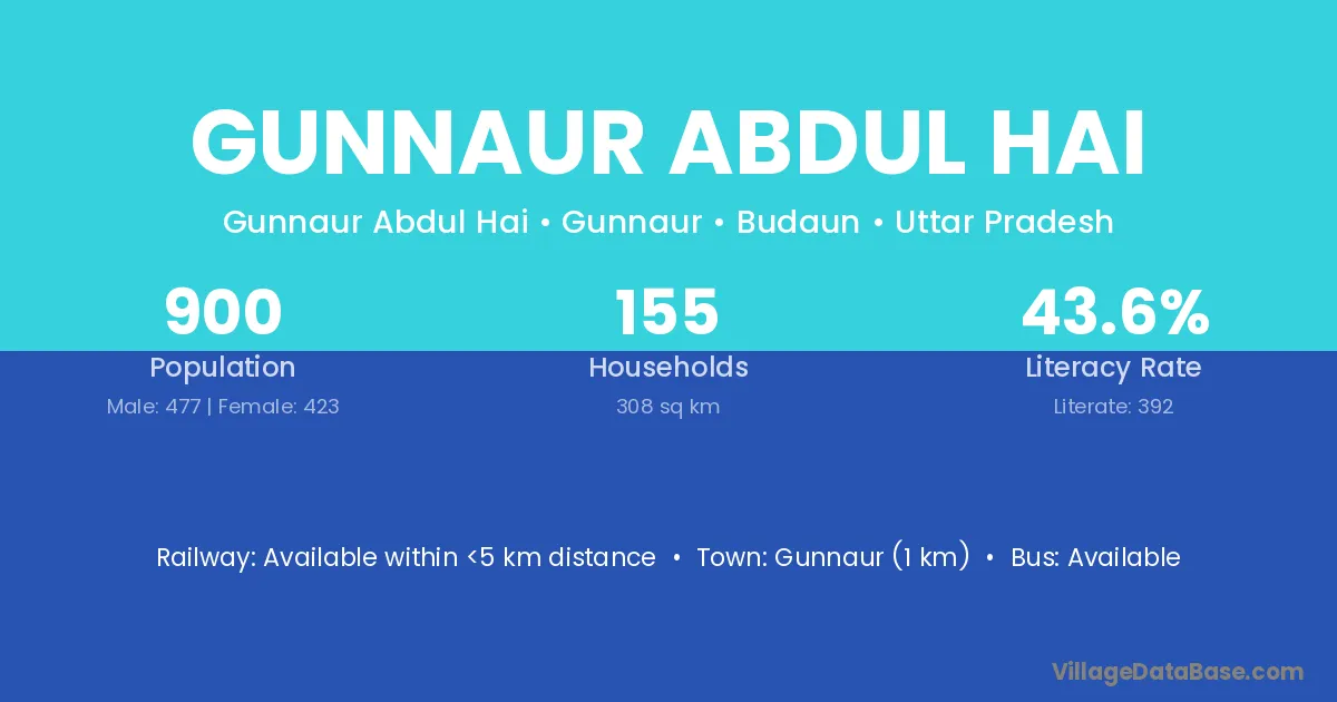 Gunnaur Abdul Hai village has a total population of 900 people, of which 477 are males and 423 are females.