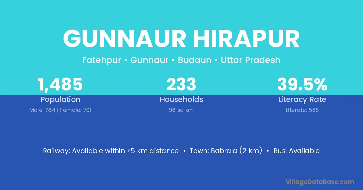 Babrala (2 km) is the nearest town to Gunnaur Hirapur village for major economic activities and is located approximately 2 km away.