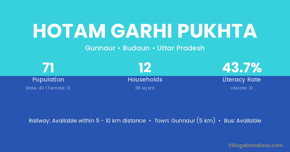 Hotam Garhi Pukhta village has a total population of 71 people, of which 40 are males and 31 are females.