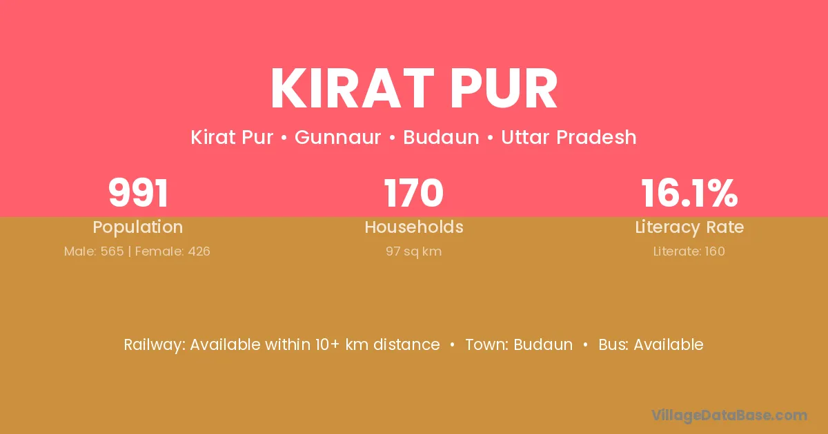 Budaun is the nearest town to Kirat Pur village for major economic activities