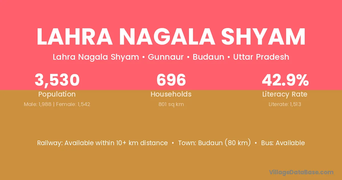Budaun (80 km) is the nearest town to Lahra Nagala Shyam village for major economic activities and is located approximately 80 km away.