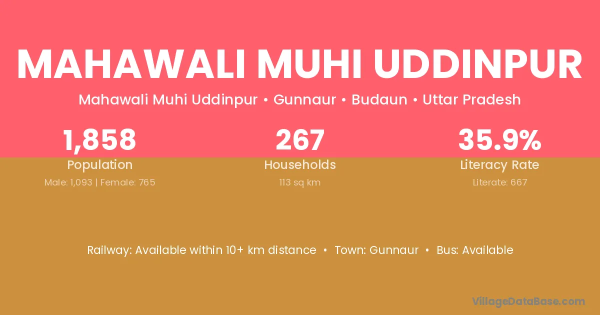Mahawali Muhi Uddinpur village has a total population of 1,858 people, of which 1,093 are males and 765 are females.