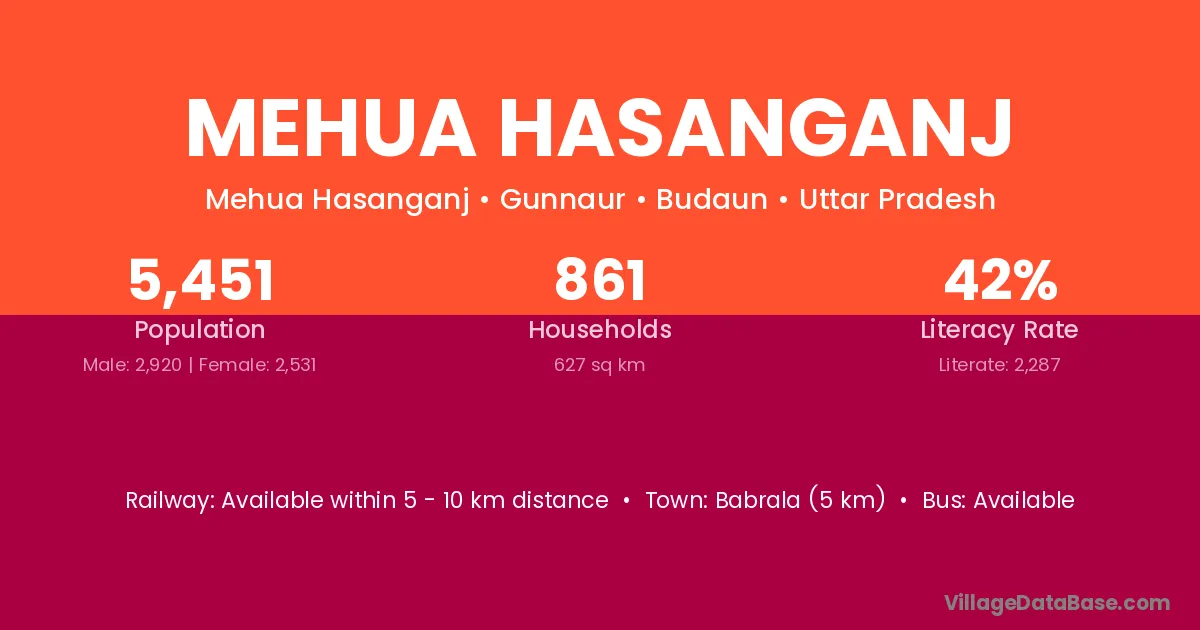 Babrala (5 km) is the nearest town to Mehua Hasanganj village for major economic activities and is located approximately 5 km away.