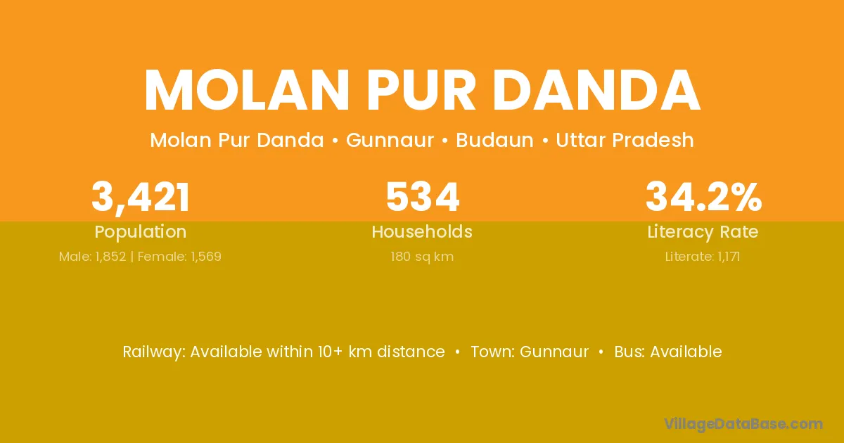Molan Pur Danda village has a total population of 3,421 people, of which 1,852 are males and 1,569 are females.