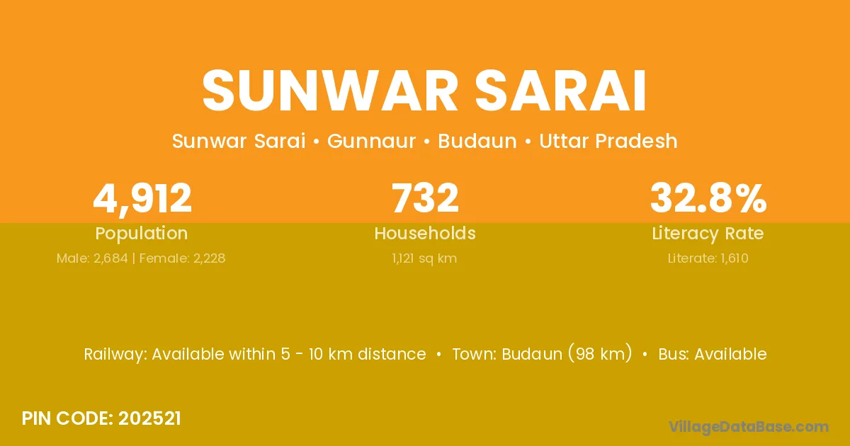Budaun (98 km) is the nearest town to Sunwar Sarai village for major economic activities and is located approximately 98 km away.
