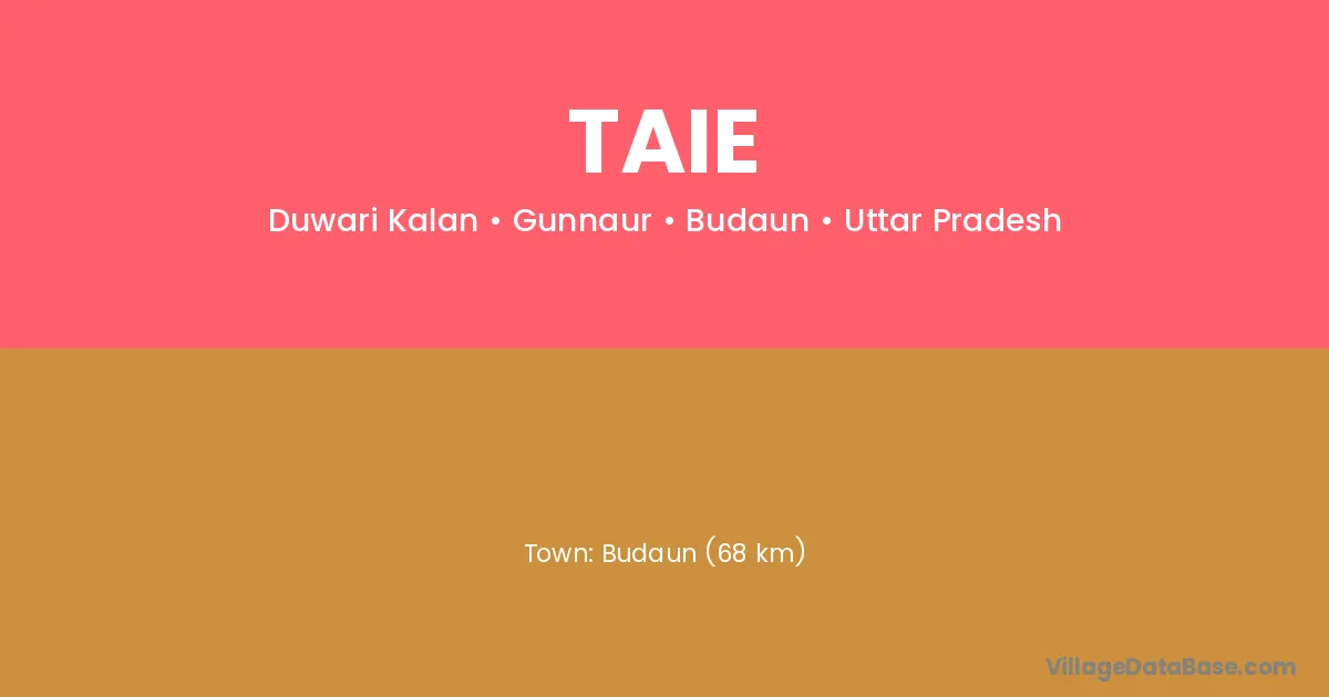 Budaun (68 km) is the nearest town to Taie village for major economic activities and is located approximately 68 km away.