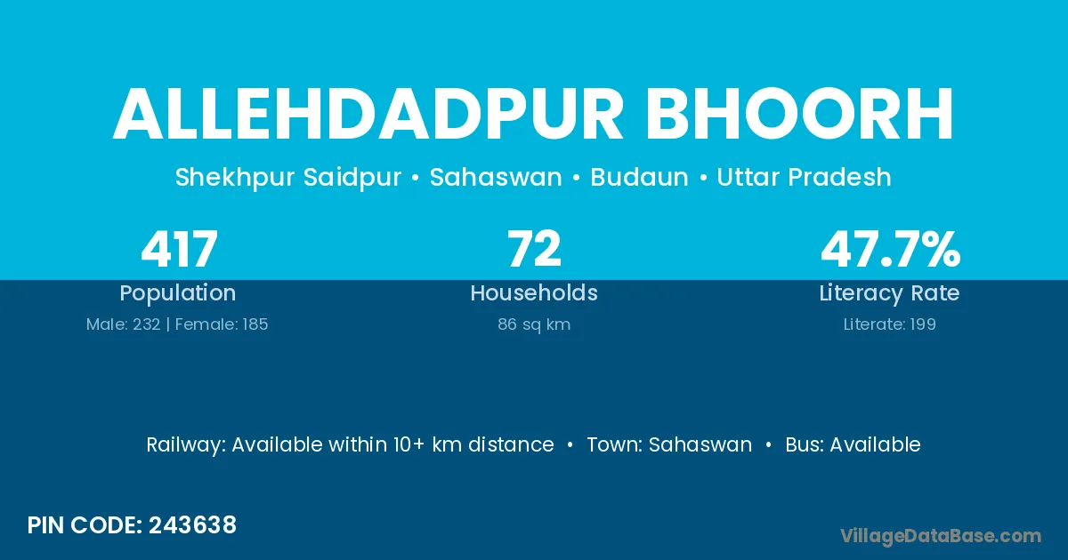 Allehdadpur Bhoorh village has a total population of 417 people, of which 232 are males and 185 are females.