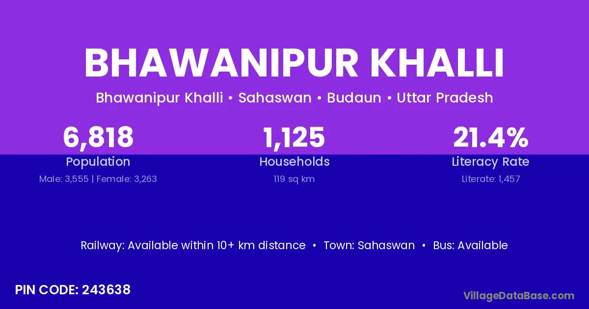 Bhawanipur Khalli village has a total population of 6,818 people, of which 3,555 are males and 3,263 are females.