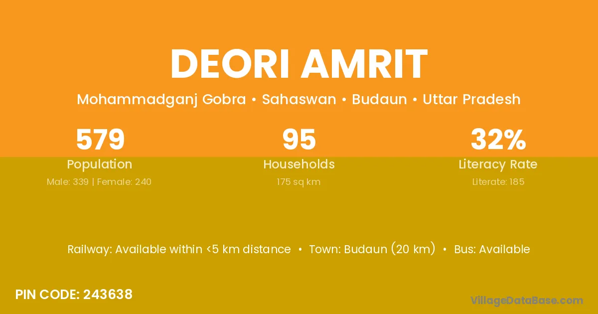 Budaun (20 km) is the nearest town to Deori Amrit village for major economic activities and is located approximately 20 km away.