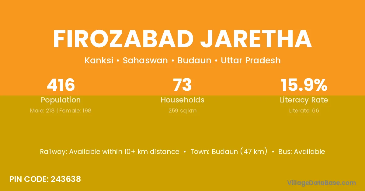 Firozabad Jaretha village has a total population of 416 people, of which 218 are males and 198 are females.