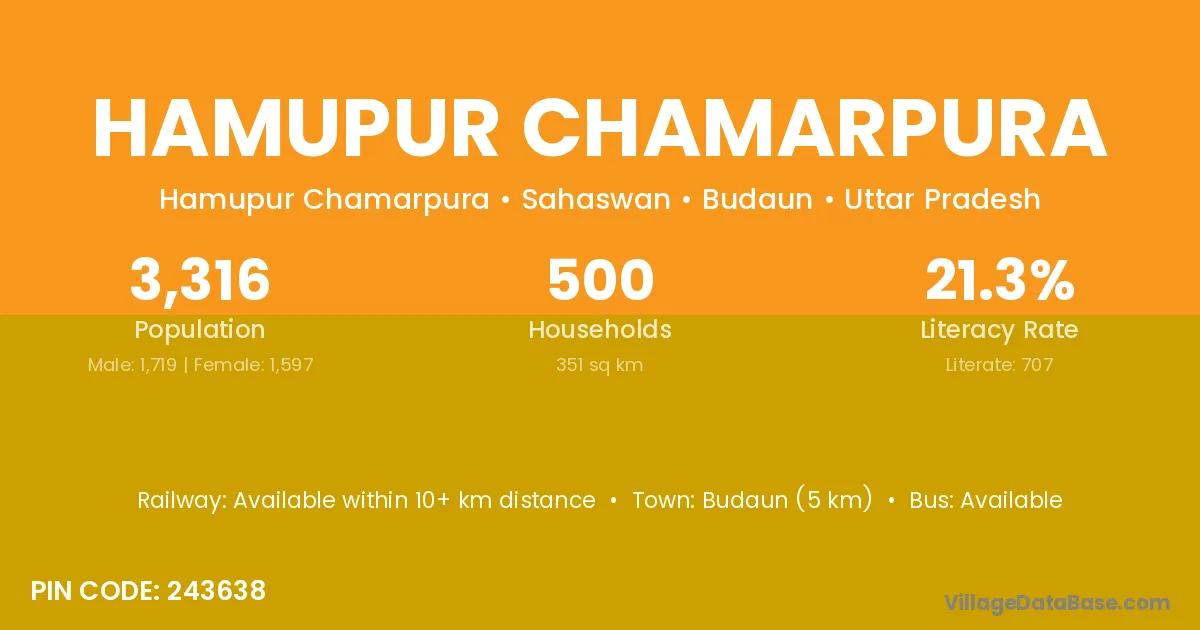 Budaun (5 km) is the nearest town to Hamupur Chamarpura village for major economic activities and is located approximately 5 km away.
