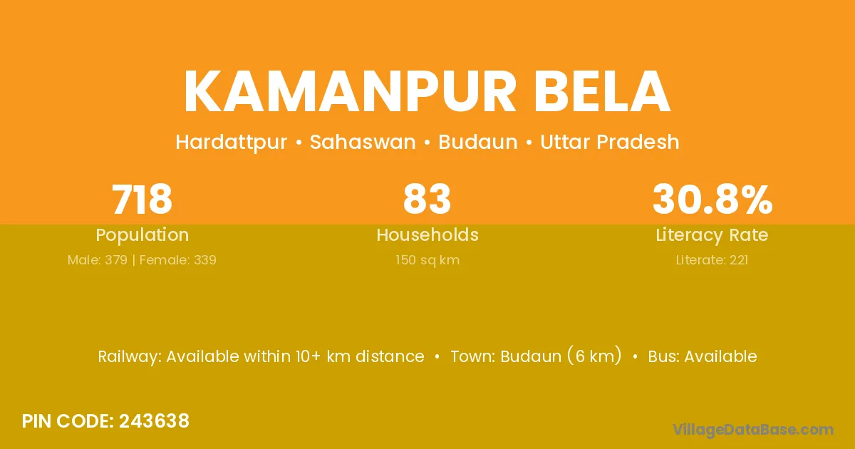 Budaun (6 km) is the nearest town to Kamanpur Bela village for major economic activities and is located approximately 6 km away.