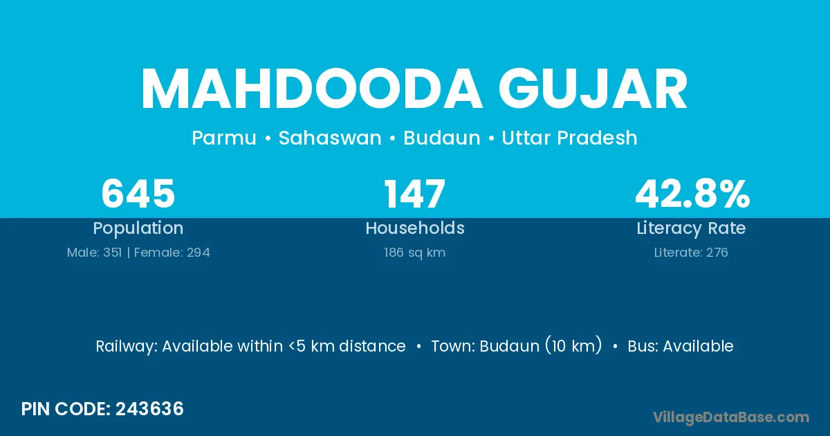 Budaun (10 km) is the nearest town to Mahdooda Gujar village for major economic activities and is located approximately 10 km away.