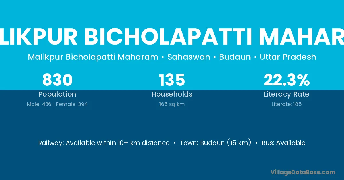 Budaun (15 km) is the nearest town to Malikpur Bicholapatti Maharam village for major economic activities and is located approximately 15 km away.
