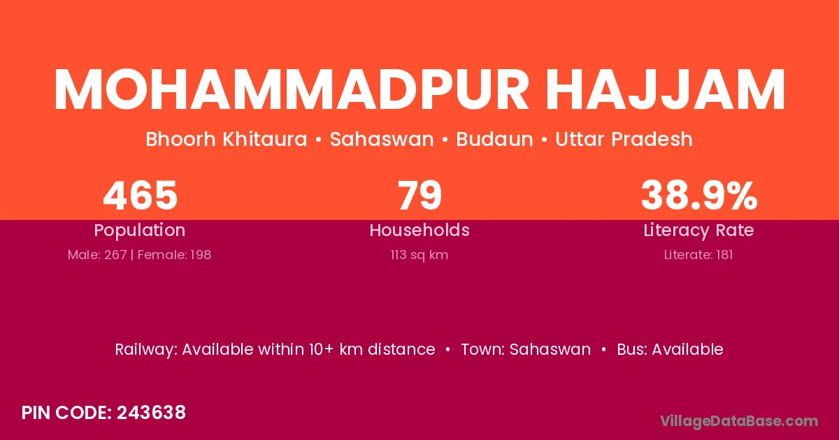 Mohammadpur Hajjam village has a total population of 465 people, of which 267 are males and 198 are females.