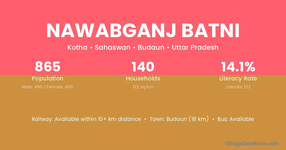 Budaun (18 km) is the nearest town to Nawabganj Batni village for major economic activities and is located approximately 18 km away.