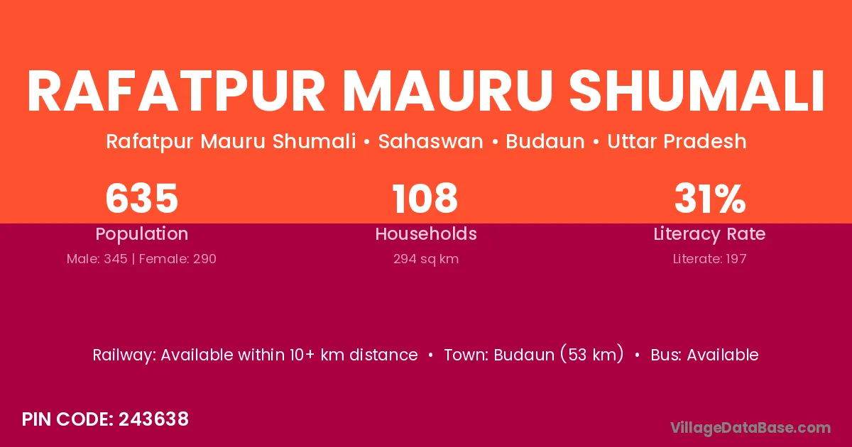 Rafatpur Mauru Shumali village has a total population of 635 people, of which 345 are males and 290 are females.