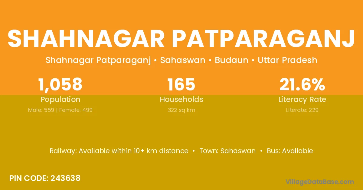 Shahnagar Patparaganj village has a total population of 1,058 people, of which 559 are males and 499 are females.