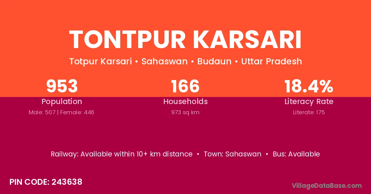 Tontpur Karsari village has a total population of 953 people, of which 507 are males and 446 are females.