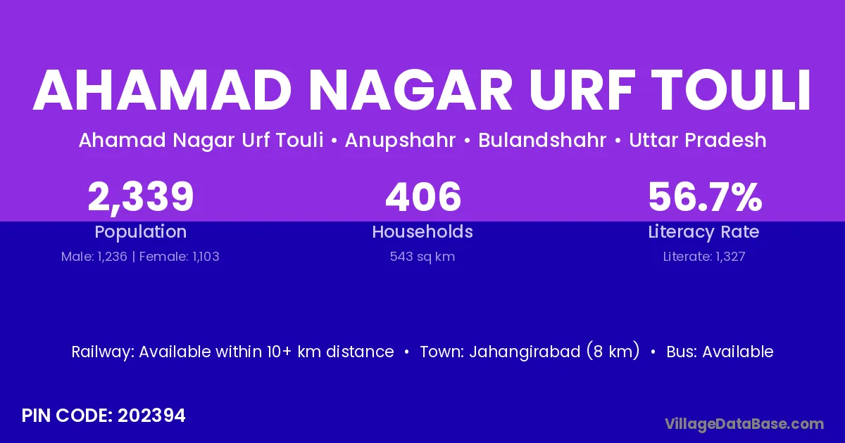 Ahamad Nagar Urf Touli village has a total population of 2,339 people, of which 1,236 are males and 1,103 are females.