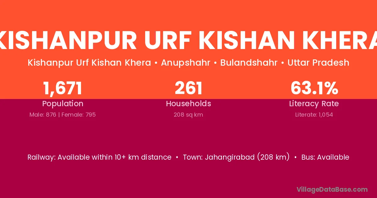 Jahangirabad (208 km) is the nearest town to Kishanpur Urf Kishan Khera village for major economic activities and is located approximately 208 km away.