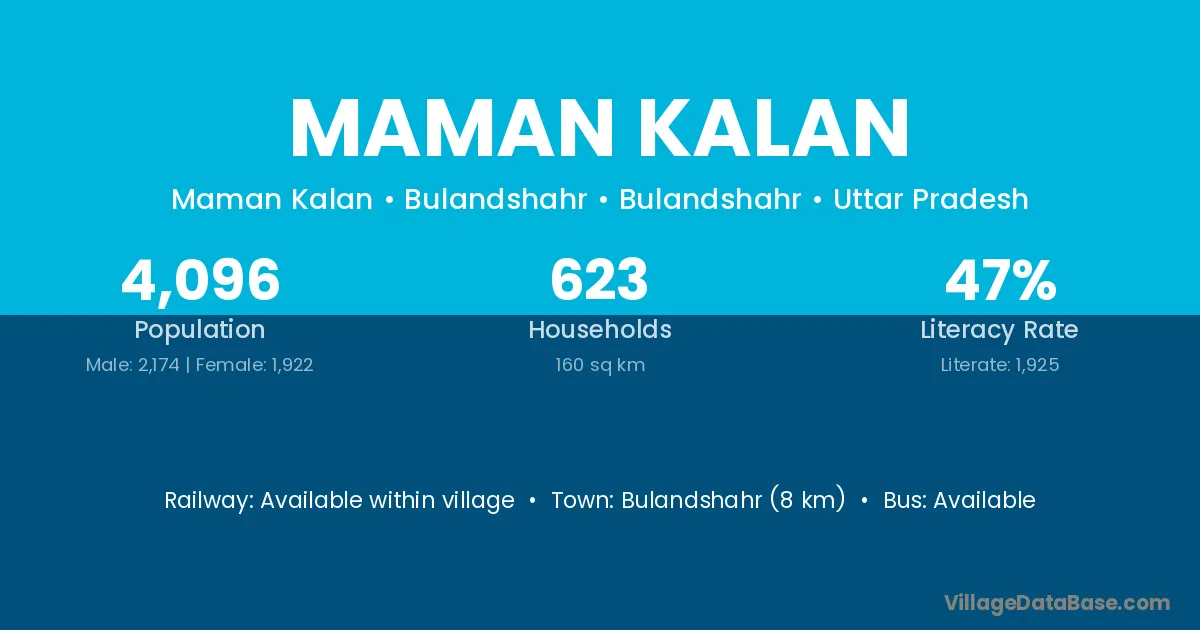 Bulandshahr (8 km) is the nearest town to Maman Kalan village for major economic activities and is located approximately 8 km away.