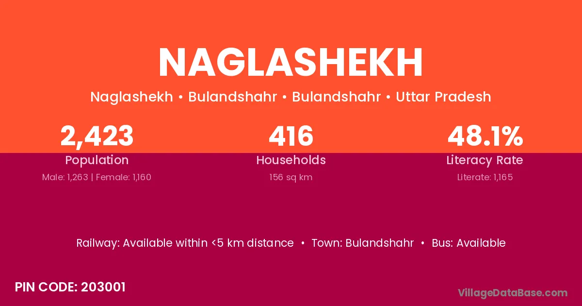 Naglashekh village has a total population of 2,423 people, of which 1,263 are males and 1,160 are females.