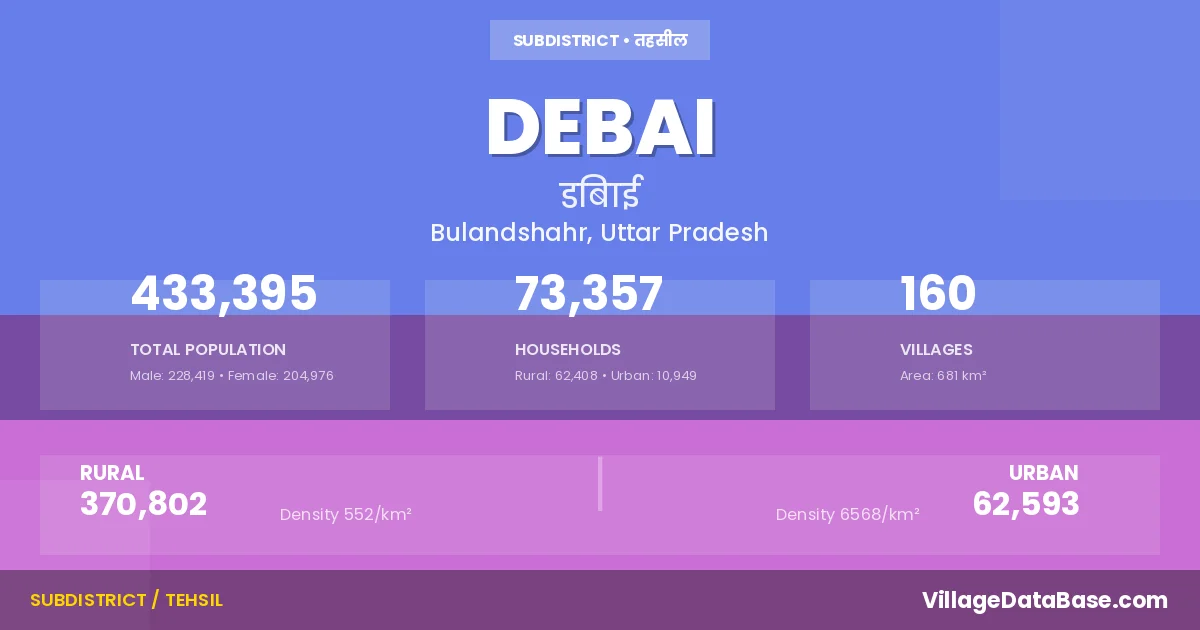 According to the 2011 census The total area of Debai Tehsil is 681 km², with a population of 433395 people. The population density is 636 inhabitants per square kilometre, and there are approximately 73357 houses in the sub district.