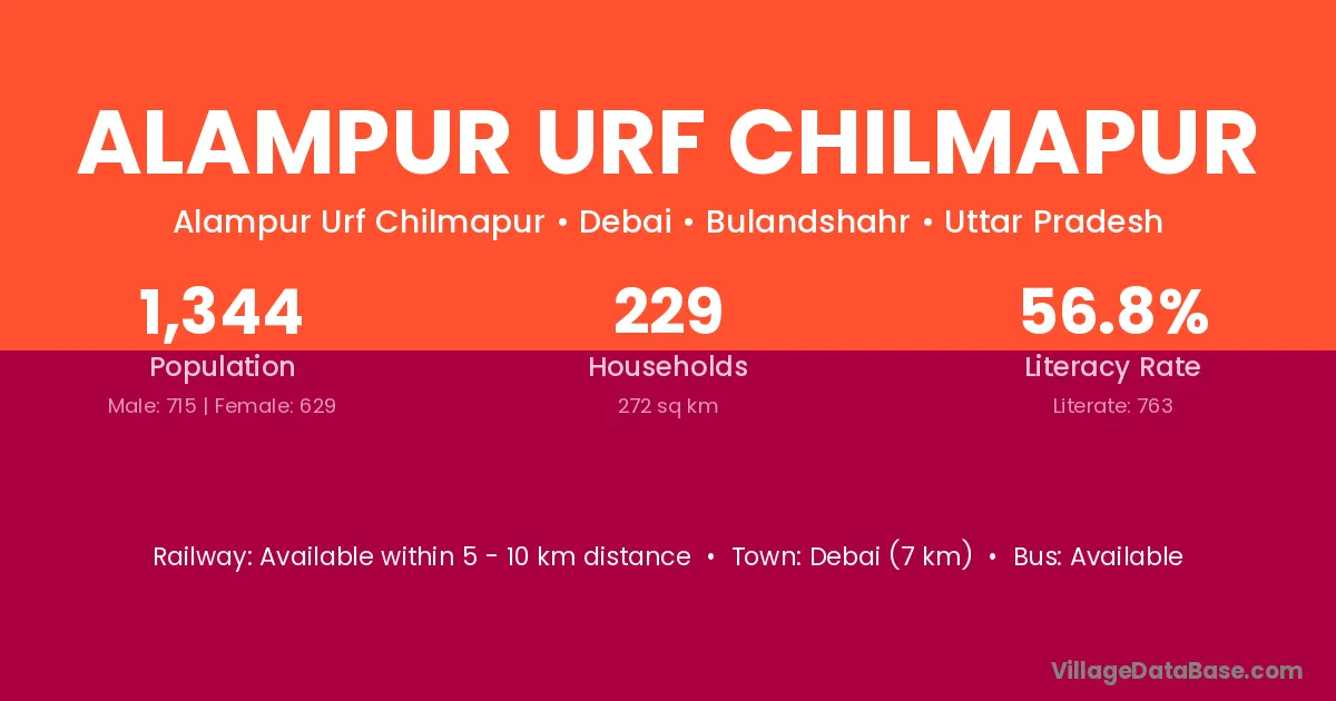 Debai (7 km) is the nearest town to Alampur Urf Chilmapur village for major economic activities and is located approximately 7 km away.