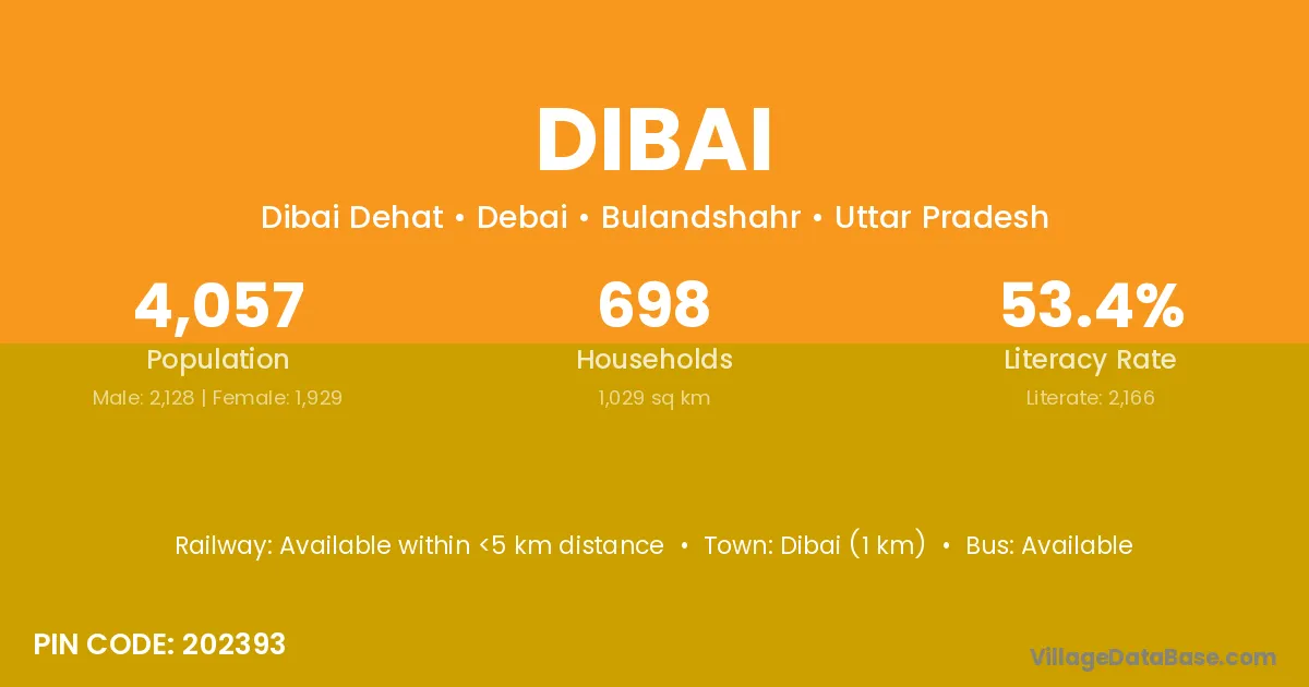 Dibai (1 km) is the nearest town to Dibai village for major economic activities and is located approximately 1 km away.