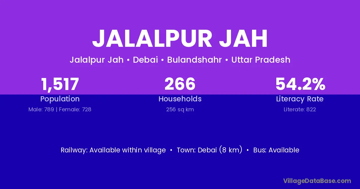 Debai (8 km) is the nearest town to Jalalpur Jah village for major economic activities and is located approximately 8 km away.
