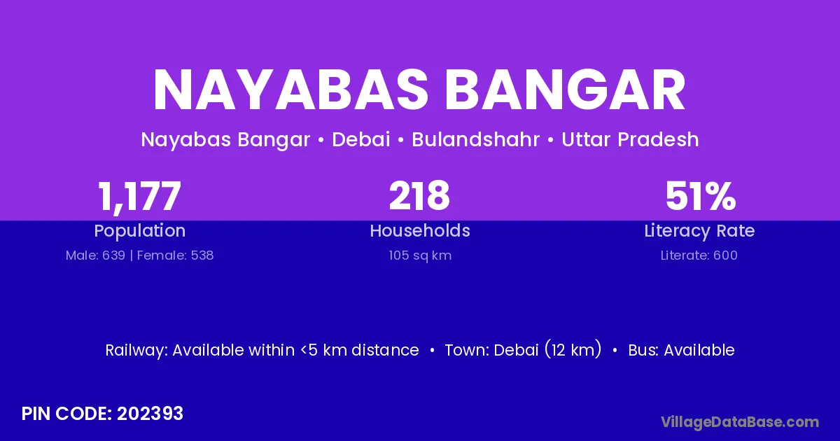 Debai (12 km) is the nearest town to Nayabas Bangar village for major economic activities and is located approximately 12 km away.